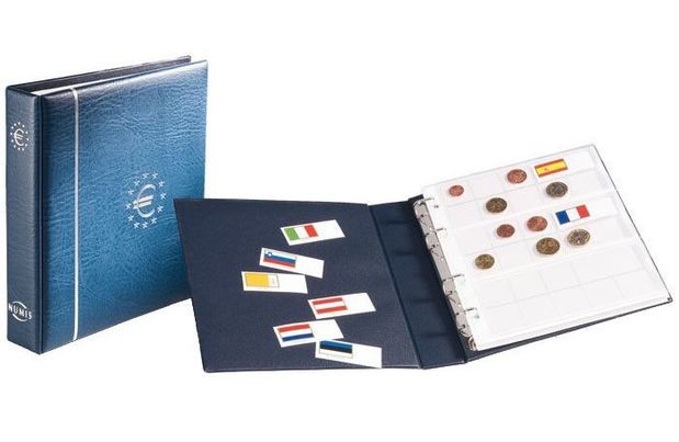 NUMIS 4-rengaskansio, jossa 7 NUMIS EURO-lehteä (21 täydelle euro-kolikkosarjalle) + lipputarrasarja, tarroissa tilaa merkinnöille. Valkeat välilehdet. Korkopainettu hopealla €-tunnus kanteen. Koko: 215 x 230 mm. Ilman koteloa.