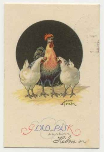 Jenny Nyström Kukko ja kanat, pienikokoinen kortti lähetetty 1927.